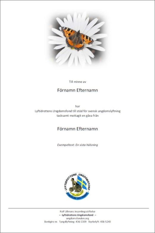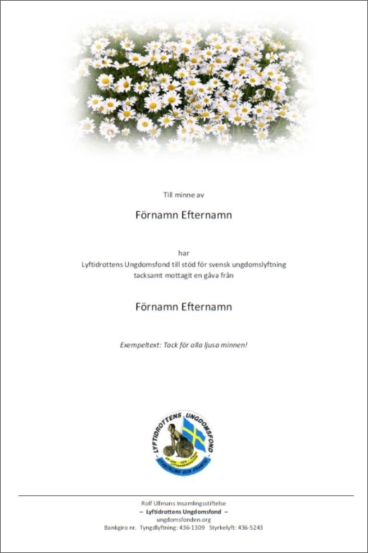 - Ange gåvans storlek i kr. Beloppet skall ha inkommit på Lyftidrottens Ungdomsfonds konto innan vi skickar brevet och summan skall vara minst 300 kr.